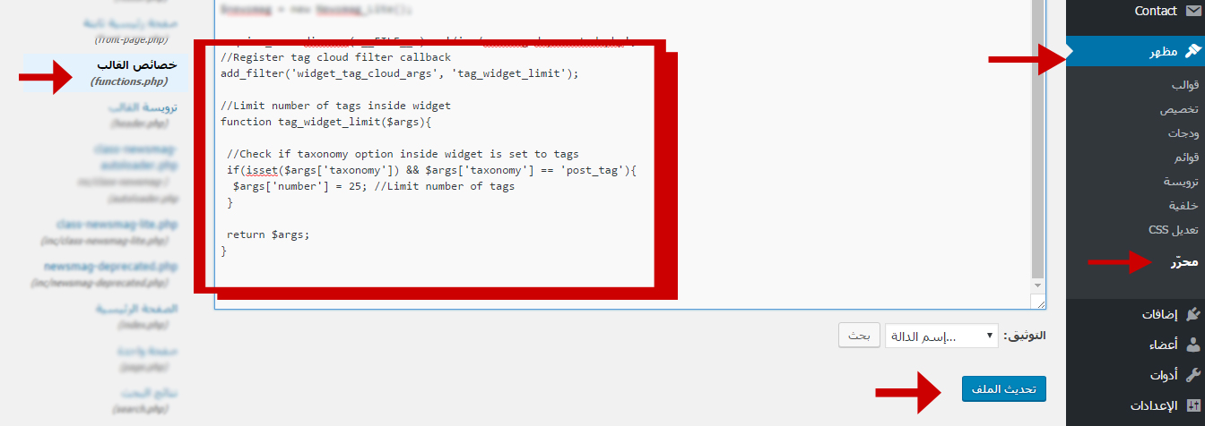 //Register tag cloud filter callbackadd_filter('widget_tag_cloud_args', 'tag_widget_limit'); //Limit number of tags inside widgetfunction tag_widget_limit($args){ //Check if taxonomy option inside widget is set to tagsif(isset($args['taxonomy']) && $args['taxonomy'] == 'post_tag'){ $args['number'] = 10; //Limit number of tags} return $args;}الرقم 10 يشير إلى عدد الوسوم التي ستظهر في القائمة كحد أقصى، يمكنك اختيار الرقم المناسب ثم حفظ الملف.