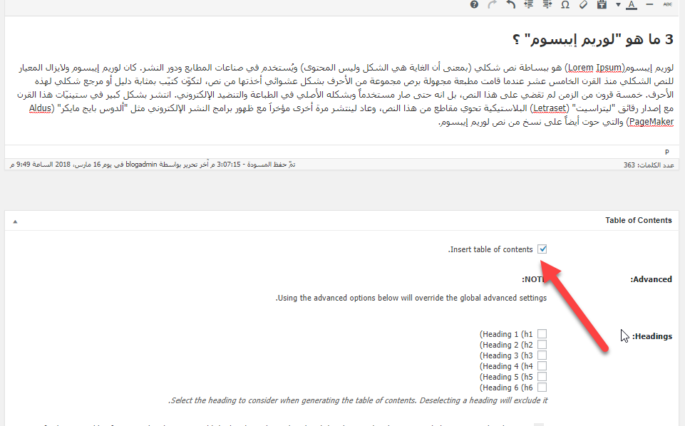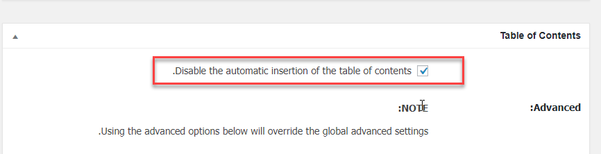 أيضاً يمكنك تحديد Disable the automatic insertion of the table of contents لتعطيل الإدراج التلقائي لجدول المحتويات في هذه المقالة فقط إذا تم تمكين الإدراج التلقائي من الإعدادات العامة.