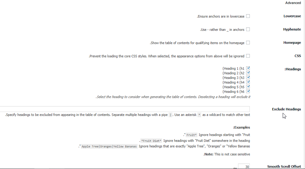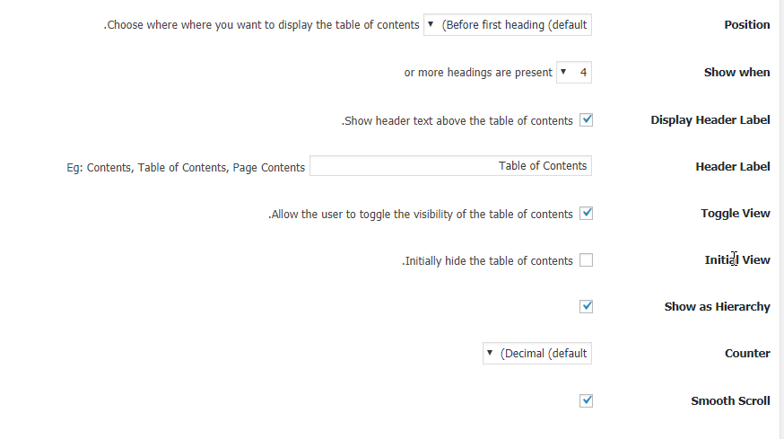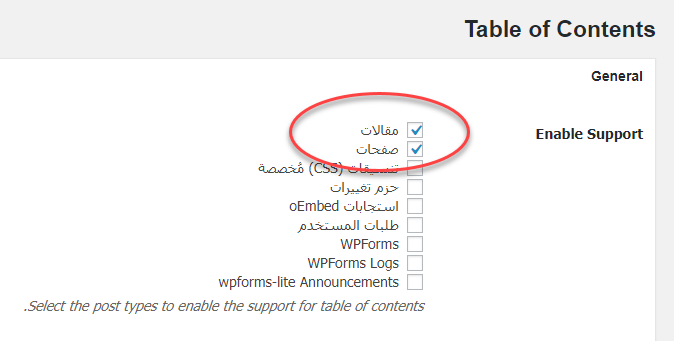 بعد التفعيل انتقل إلى الإعدادات > Table of Contents حيث يمكنك في هذه الصفحة إدارة الإعدادات العامة لإضافة جدول المحتويات.