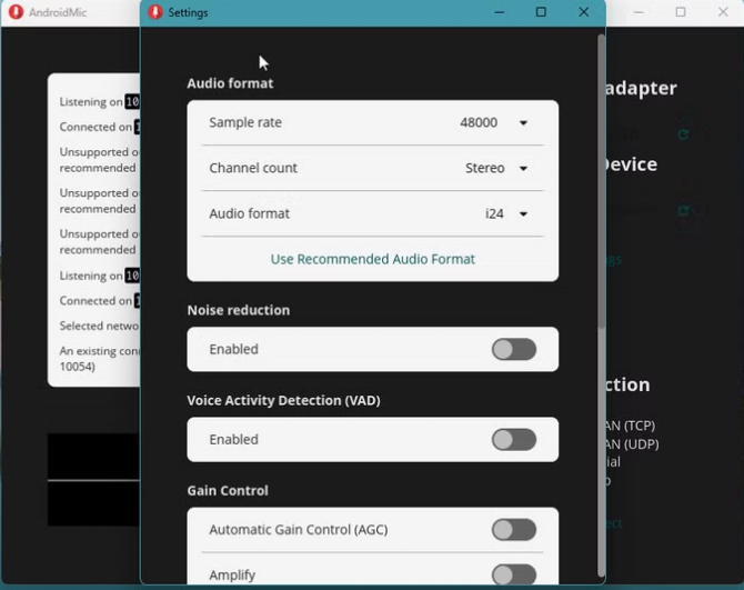 بمجرد تثبيت AndroidMic على الجهازين، افتح تطبيق AndroidMic على سطح المكتب، سترى ثلاثة أقسام هنا: محول الشبكة Network adapter، جهاز الصوت Audio device، والاتصال Connection.