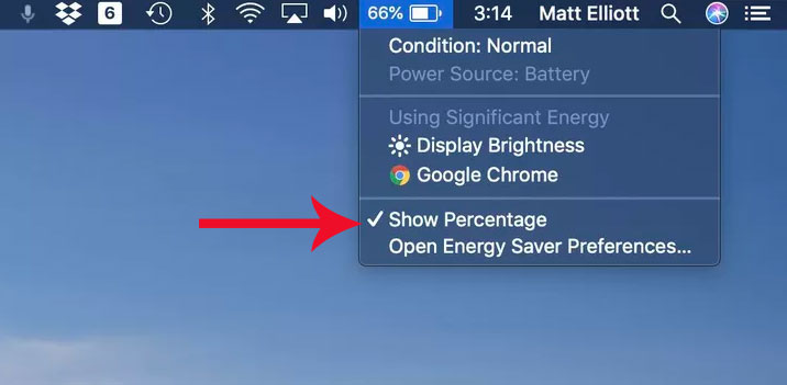 انقر فقط على رمز البطارية في شريط القائمة وانقر على عرض النسبة المئوية Show Percentage.
