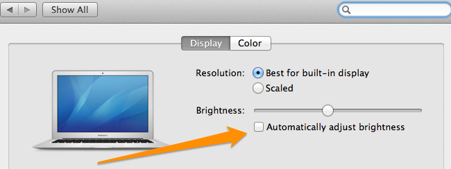 للقيام بذلك ، انتقل إلى تفضيلات النظام System Preferences ثم العرض Display وألغِ تحديد المربع الخاص بضبط السطوع تلقائياً Automatically adjust brightness.