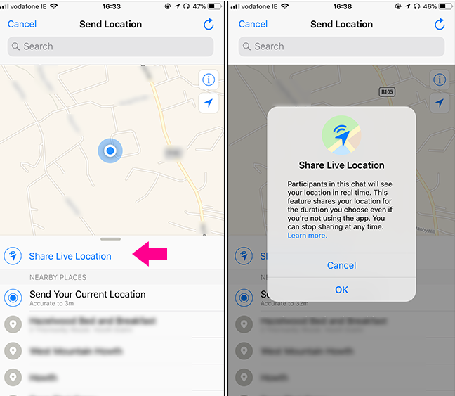لأسباب قد تتعلق بالسلامة، من المحتمل أن تضطر لمشاركة موقعك الحي دائماً مع شخص آخر، بحيث يتمكن من معرفة الموقع الجغرافي خاصتك في أية لحظة، اختر Share Live Location وعندها ستشاهد تحذيراً بأنك ستشارك موقعك الجغرافي حتى في حال كنت لا تستخدم التطبيق.