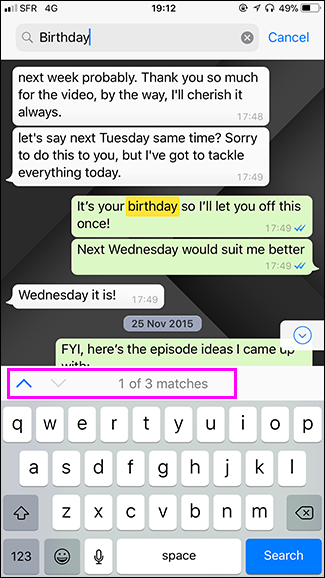 اكتب الكلمة التي تريد البحث عنها، سيقوم واتساب بتحديد الكلمة المطلوبة ضمن الرسائل، ووتحديد عدد مرات ورودها في المحادثة، كما سيظهر أسهم للتنقل بين النتائج إلى الاعلى والاسفل.