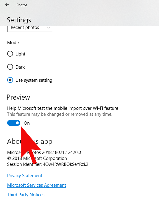 3- مرر إلى أسفل نافذة الإعدادات حتى يظهر القسم Preview ثم قم بتشغيل الخيار “Help Microsoft test the mobile import over Wi-Fi feature.”
