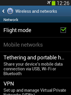 يمكنك تشغيل وضع الطيران Flight mode من ضمن إعدادات الهاتف المحمول: