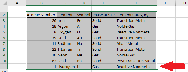 يمكنك أن ترى أن عمود “الرقم الذري” (Atomic Number) قد تم فرزه من الأدنى إلى الأعلى، ولكن لم تتغير المعلومات المقابلة في الأعمدة الأخرى.