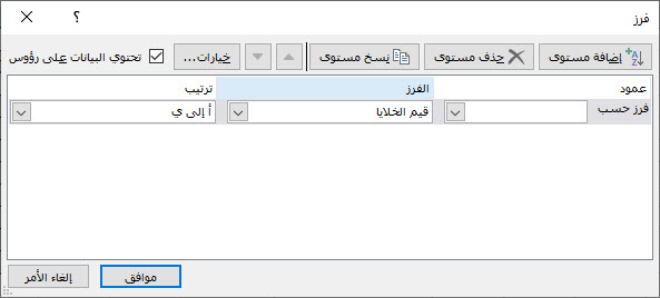 لاحظ أن هناك خيارات أخرى مثل فرز حسب قيم الخلايا، لون الخلية، لون خط الخلية.. أو نوع الترتيب (تصاعدي تنازلي)