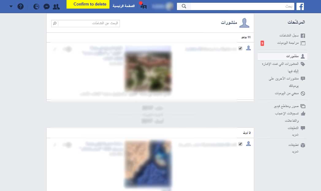 إذا كنت تريد حذف أشياء محددة مثل منشوراتك الخاصة أو المنشورات التي تمت الإشارة لك فيها أو غيرها، استخدم المرشحات المناسبة.