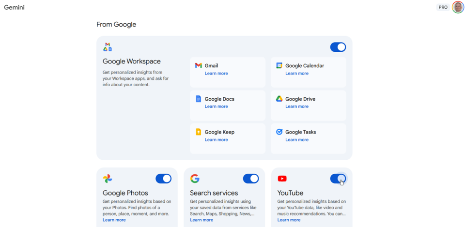 الذكاء الشخصي، وهو حالياً في مرحلة تجريبية، خيار جديد يمكّن جيميناي من تخصيص ردوده باستخدام بيانات من التطبيقات المتصلة مثل Gmail وGoogle Calendar وGoogle Drive وYouTube وGoogle Search وGoogle Photos.