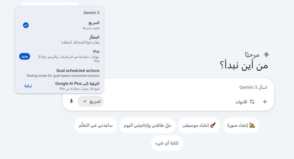 يعدّ كلٌّ من Gemini 3 و3.1 أحدث طرازات الذكاء الاصطناعي من جوجل، يمكنك الاختيار بين ثلاثة أوضاع مختلفة حسب احتياجاتك.